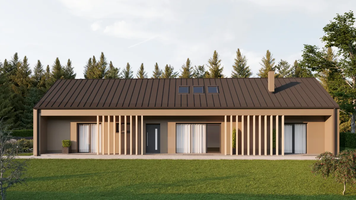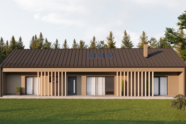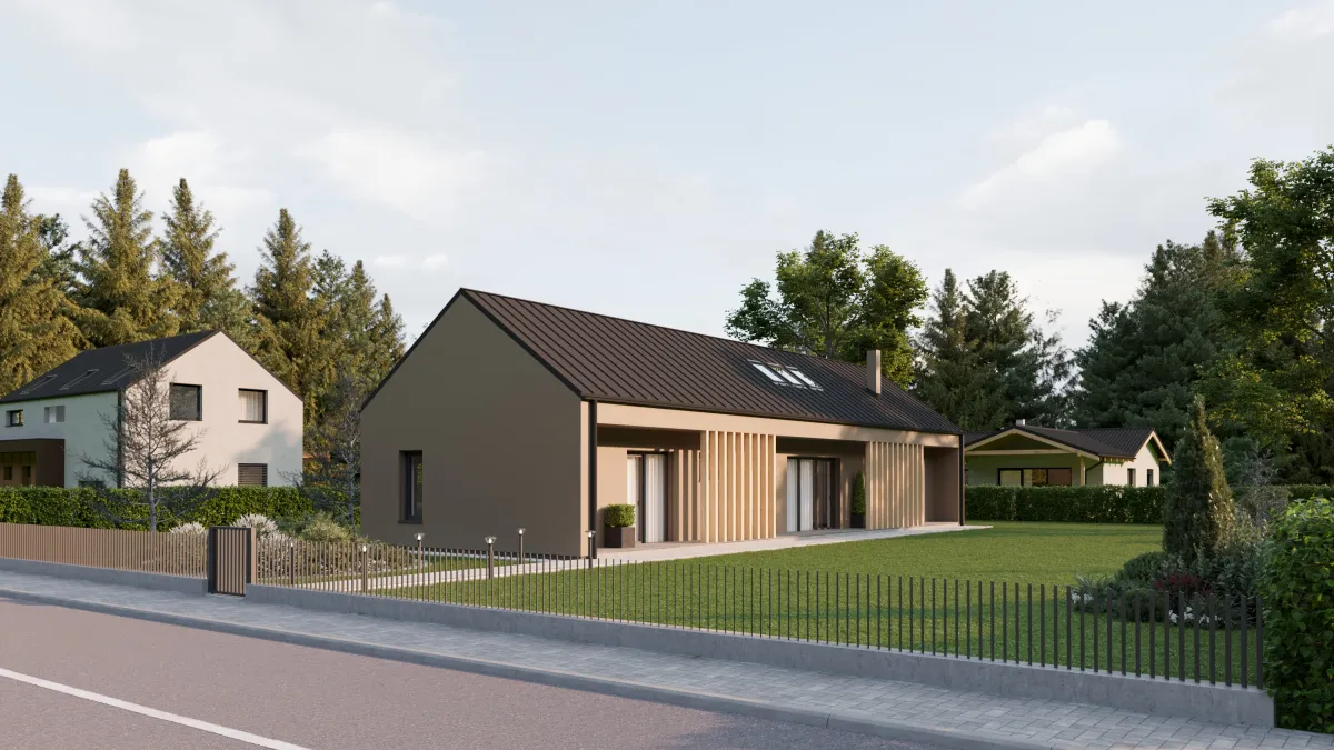 Fasáda s výraznými vertikálnymi lamelami pôsobí štýlovo a súčasne – chráni pred slnkom a zároveň dodáva domu osobitý charakter.
