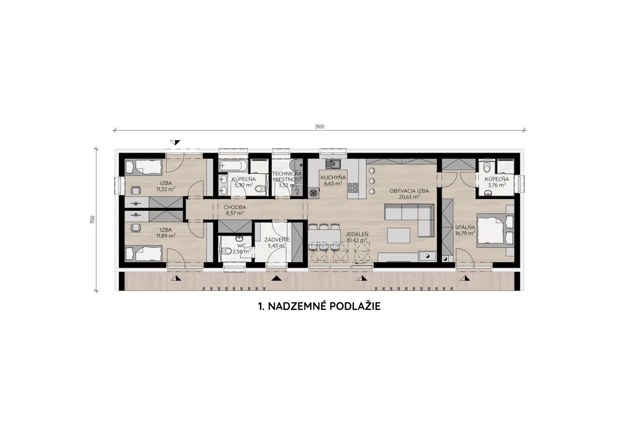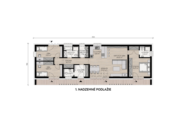 V srdci dispozície sa nachádza otvorená obývacia izba s jedálňou a kuchyňou, ktoré tvoria prirodzené centrum rodinného života.