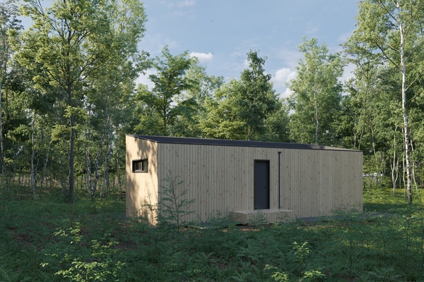 B 15 je malý, ale premyslene navrhnutý domček s drevenou fasádou, ktorý ponúka ideálne riešenie pre štartovacie bývanie pre páry alebo ako tichá víkendová chatka uprostred prírody.