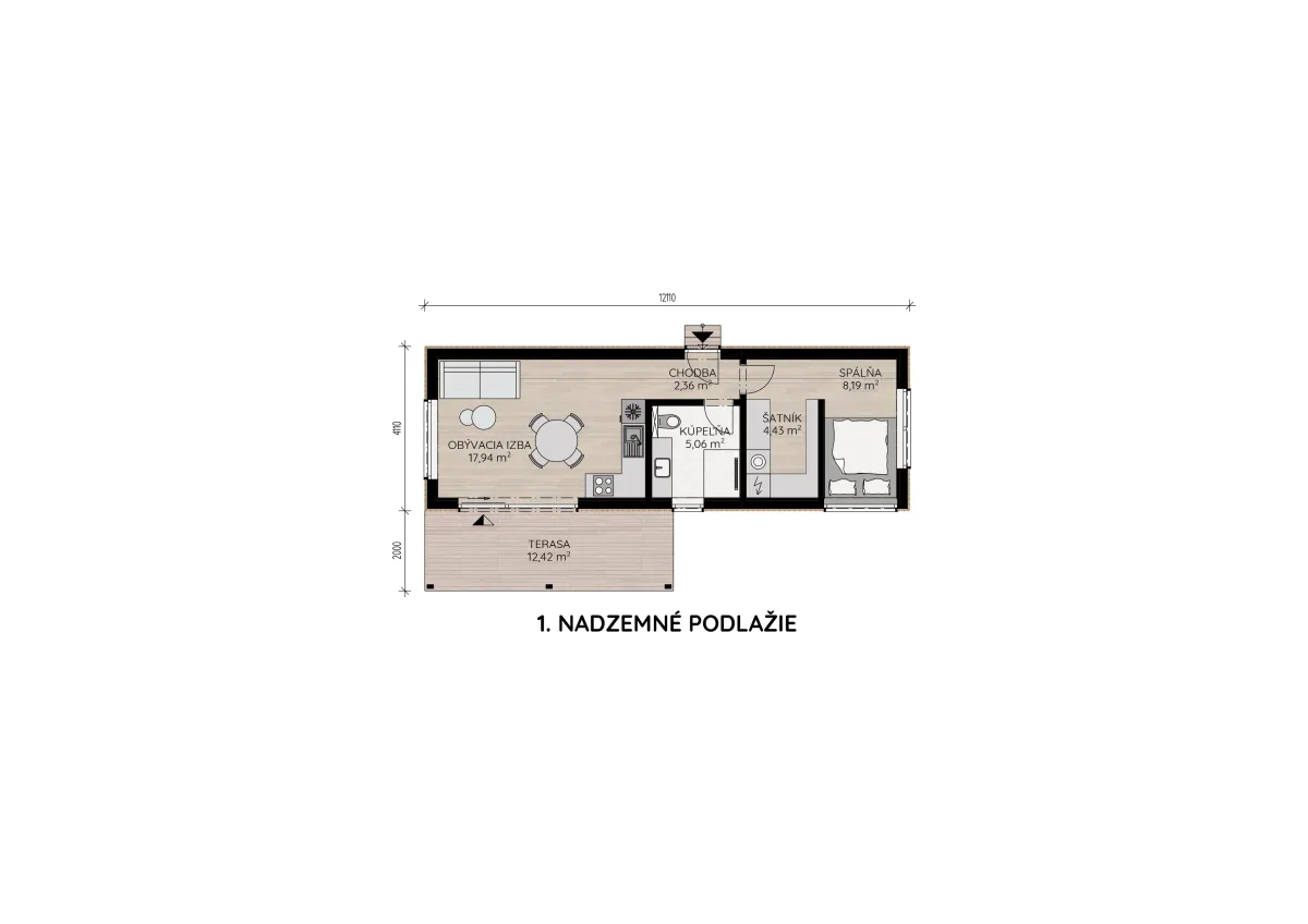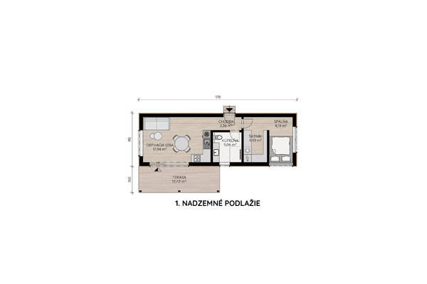 Vďaka svojej úzkej dispozícii ho bez problémov umiestnite aj na menší či úzky pozemok. Interiér je navrhnutý tak, aby z neho dostal maximum – veľké francúzske okná púšťajú do priestoru veľa svetla a vytvárajú vzdušnú a príjemnú atmosféru.