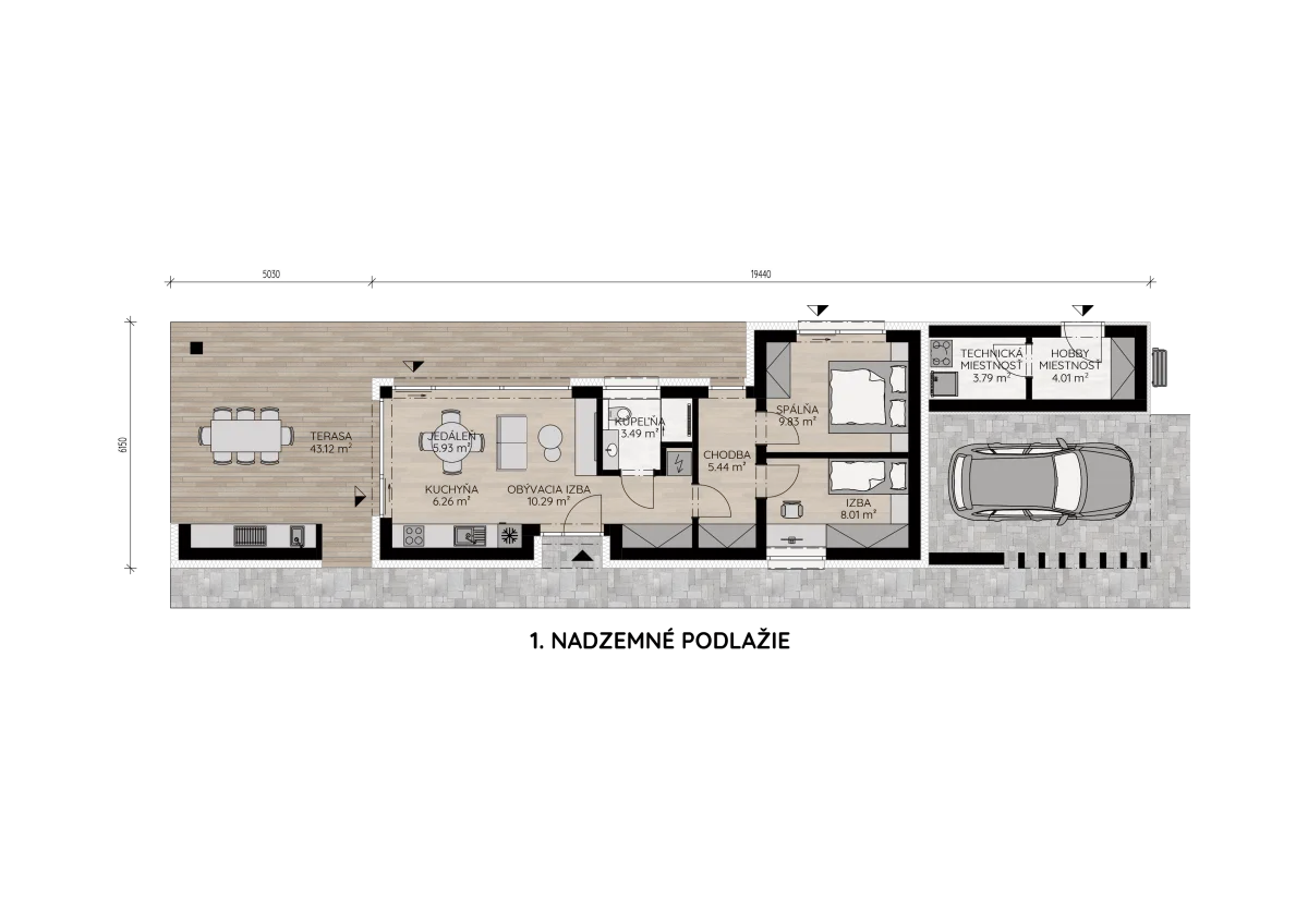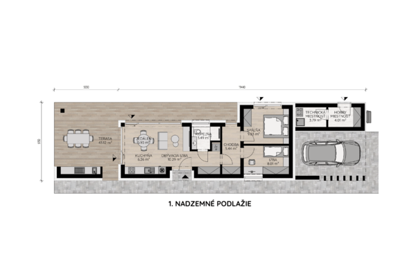 Najväčšou devízou domu je priestranná krytá terasa prepojená s exteriérovou kuchyňou – miesto, kde si užijete letné večery, grilovanie aj oddych v súkromí. Dispozícia je jednoduchá, logicky riešená a zabezpečuje komfortné každodenné fungovanie.