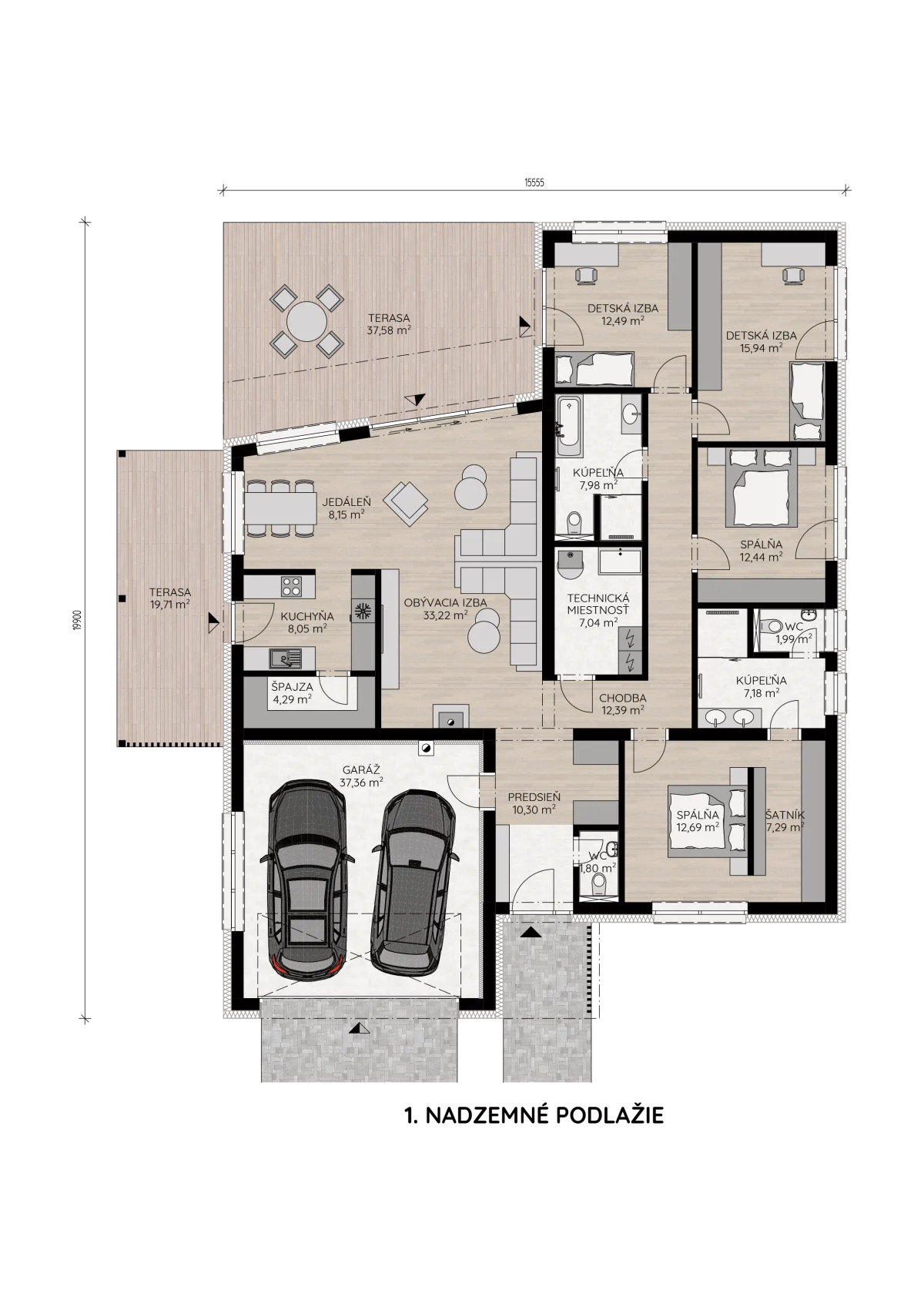 Veľké okná zaplavujú interiér prirodzeným svetlom a vytvárajú príjemnú atmosféru. Dobre premyslený pôdorys ponúka dostatok súkromia pre každého člena domácnosti a zároveň umožňuje pohodlné spoločné chvíle. Tento dom je ideálnym miestom pre modernú rodinu, ktorá hľadá komfortné bývanie.