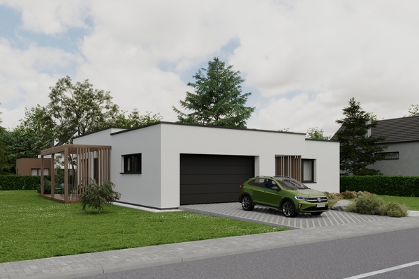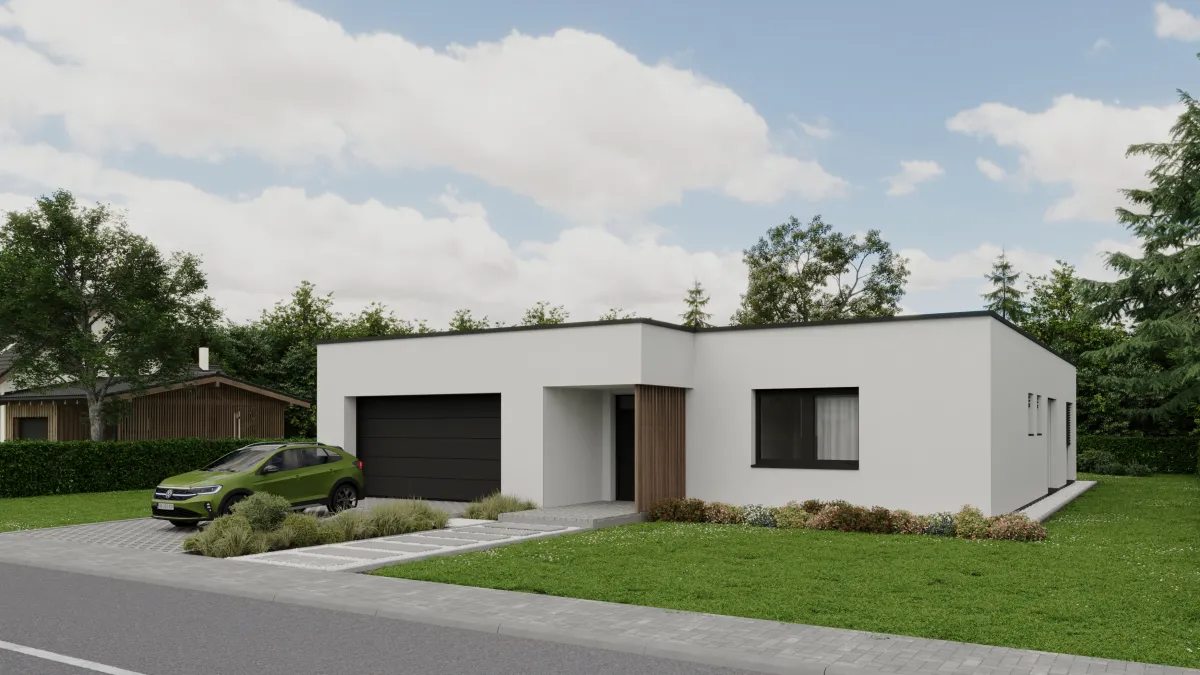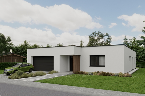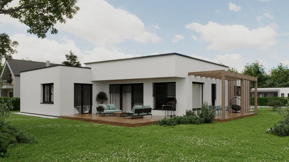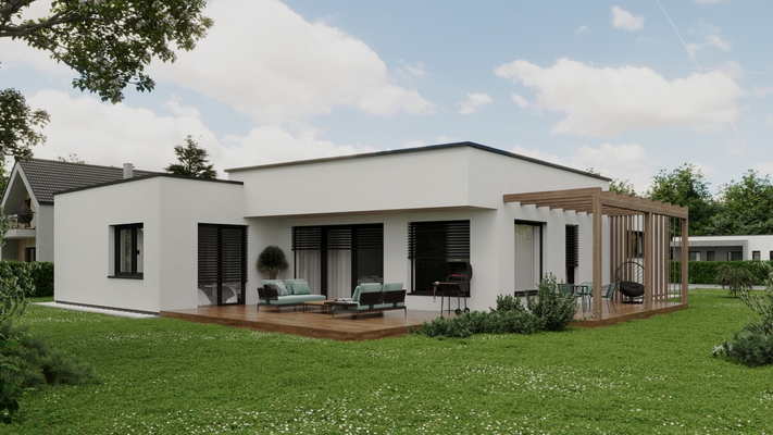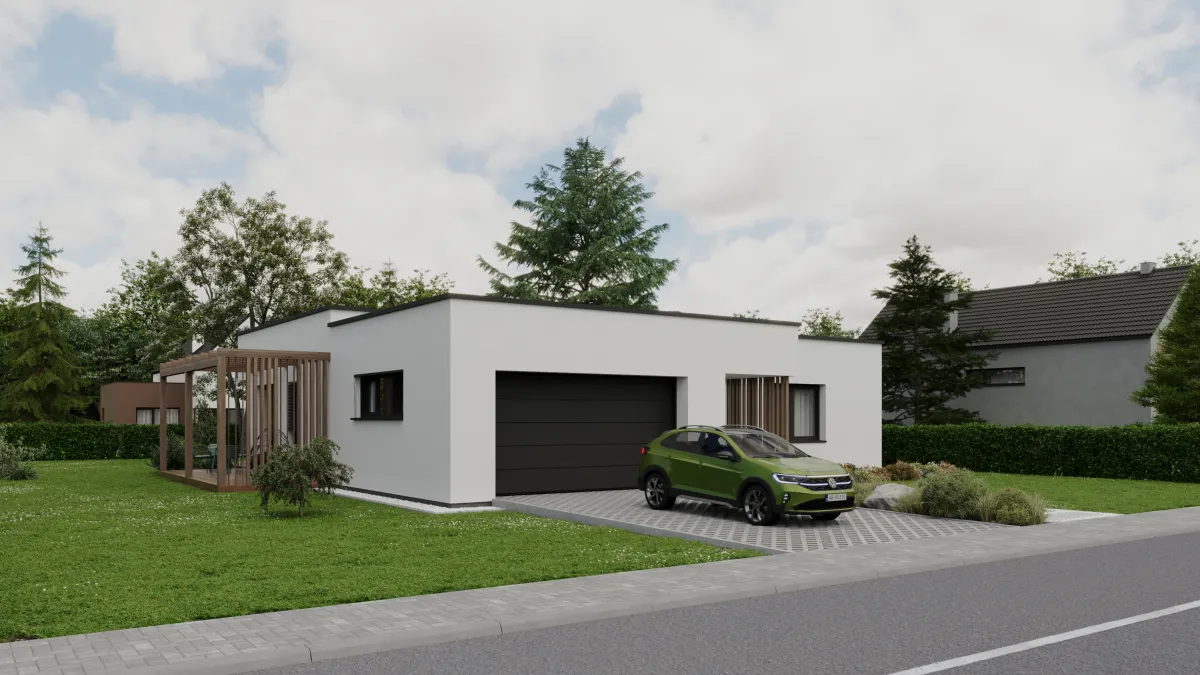 Dominantou domu je plochá strecha, ktorá mu dodáva čistý, súčasný vzhľad a zároveň elegantne prekrýva vstup aj hlavnú terasu.